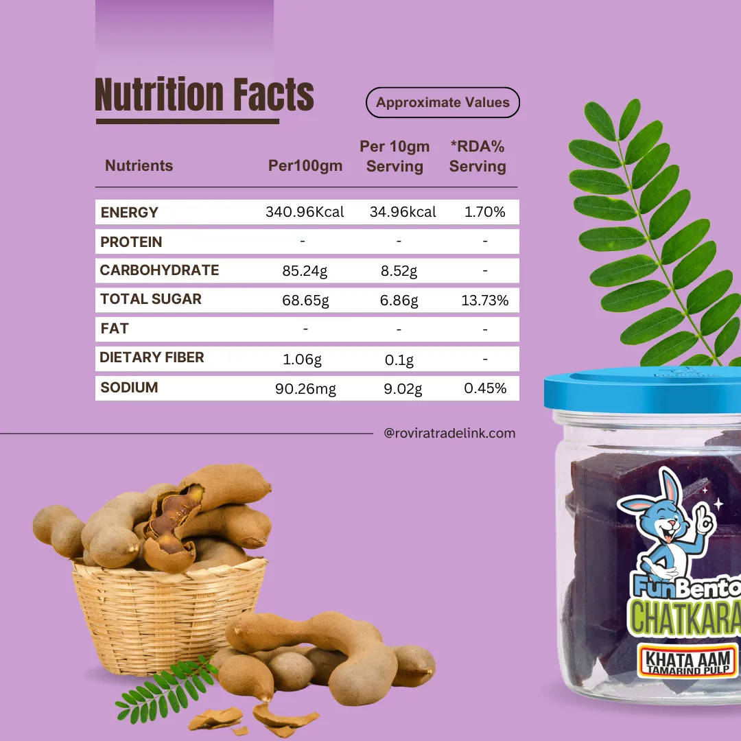 Tamarind Pulp (60%), Mango Pulp(20%), Sugar, Citric Acid (INS330), Pectin (INS 440), Potassium, Metabisulphate (INS 224), Contains Permitted Class II Preservatives, Contains Permitted Synthetic food colors,